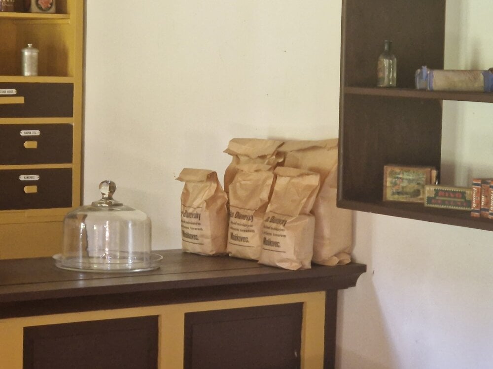 Vrecúška i sklenená nádoba na cukríky sú pôvodné z Dianovského obchodu.